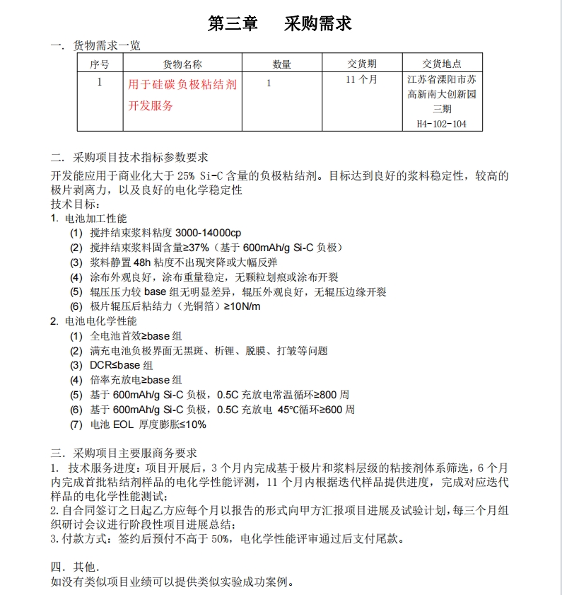 用于硅碳負(fù)極粘結(jié)劑開(kāi)發(fā)服務(wù)詢(xún)價(jià)公告